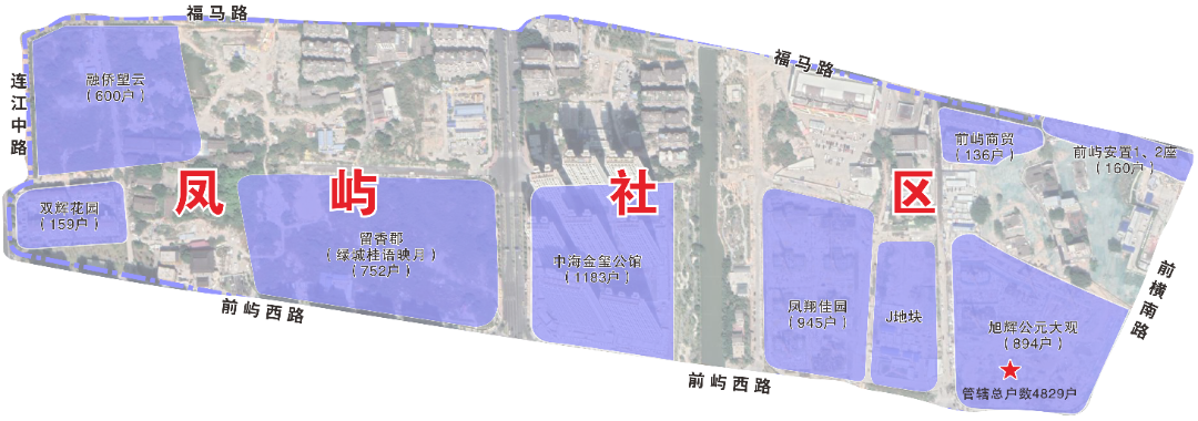 主要住宅小区:凤翔佳园、旭辉公元大观、前屿商贸、前屿安置1、2座,中海金玺公馆、双辉花园、融侨望云、留香郡(绿城桂语映月)。