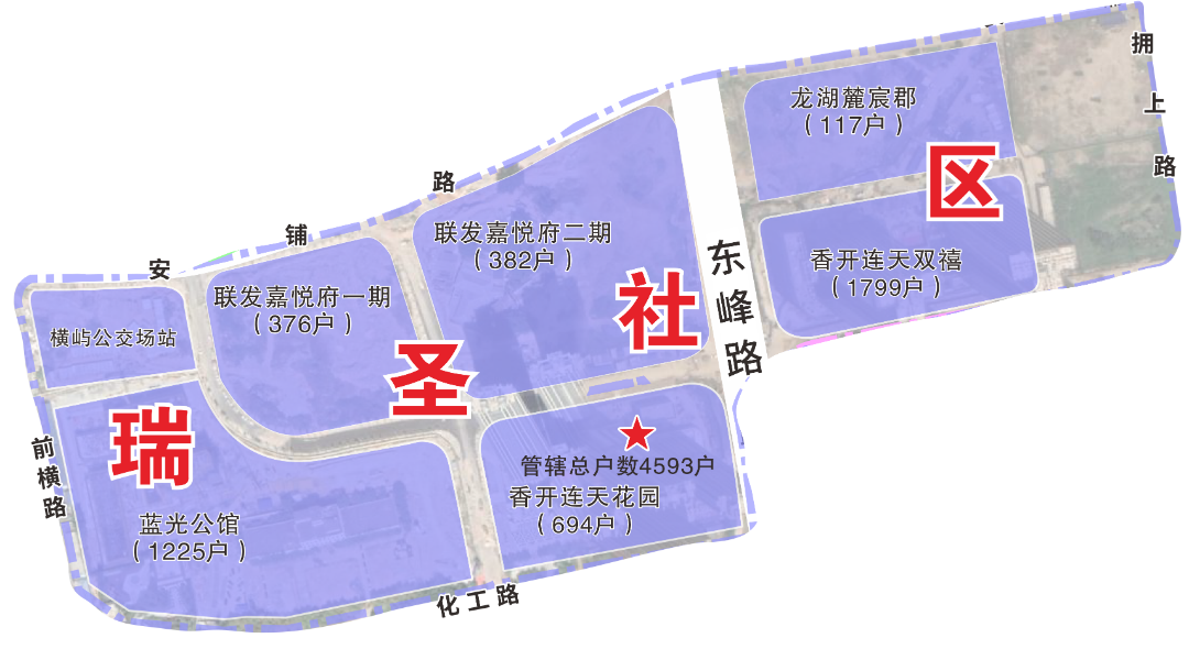 社区四至范围:东至拥上路、东峰路,南至化工路,西至前横路,北至安铺路。