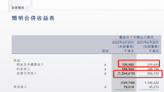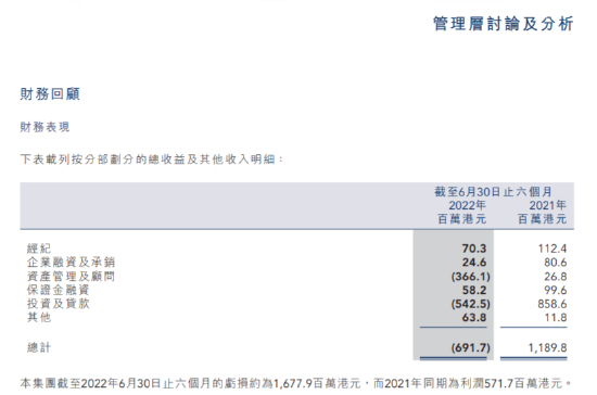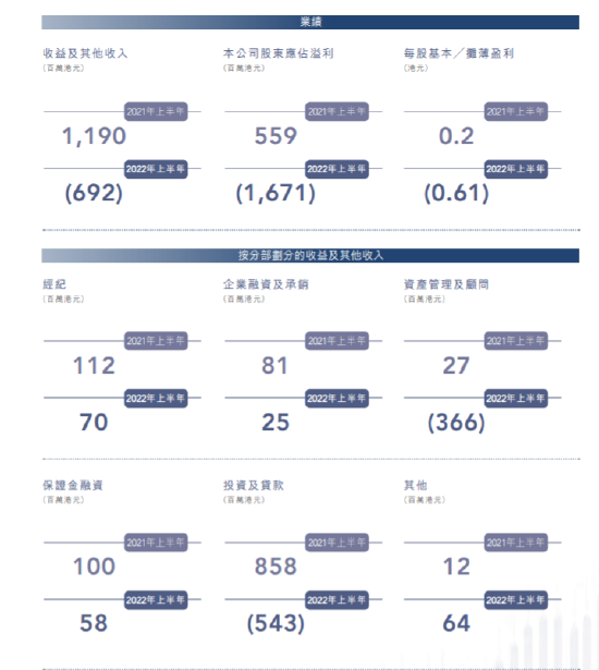 投资、贷款业务方面,自营交易亏损为8.77亿港元,较2021年同期的收入5.86亿港元减少14.63亿港元。 该亏损指因集团所持股本证券及债务投资的公允价值变动及部分处置而产生的净亏损。