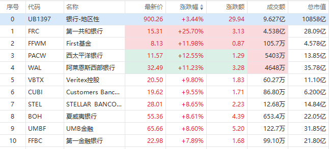 盘面上,大型银行股方面,巴克莱银行涨5.4%,花旗集团、美国银行、摩根士丹利均涨约3.5%,摩根大通涨2.8%。
