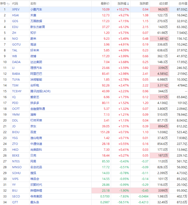 跌幅榜方面,趣头条大跌58.51%,报0.2987美元每股;哔哩哔哩跌1.9%,名创优品、网易微跌。