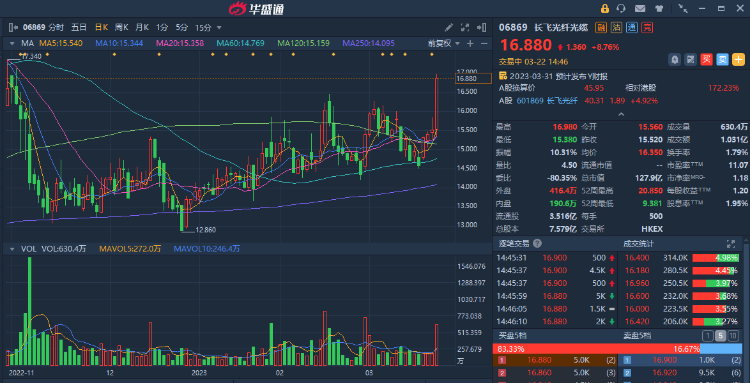 3月22日讯,长飞光纤光缆(06869)现涨近9%,截至发稿,涨8.76%,报16.88港元,成交额1.03亿港元。