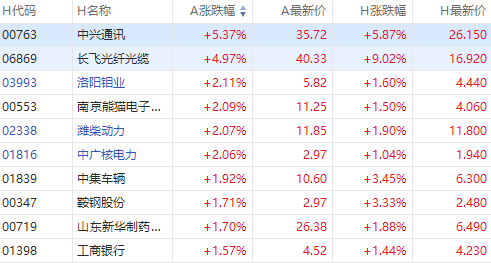 截至发稿,中兴通讯A股涨5.37%,H股现涨5.87%,长飞光纤光缆A股涨4.97%,H股现涨9.02%,洛阳钼业A股涨2.11%,H股现涨1.6%。
