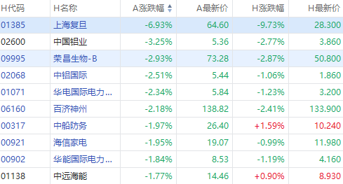 上海复旦A股跌6.93%,H股现跌9.73%,中铝国际A股跌3.25%,H股现跌2.77%,荣昌生物-B股跌2.93%,H股现跌2.87%。