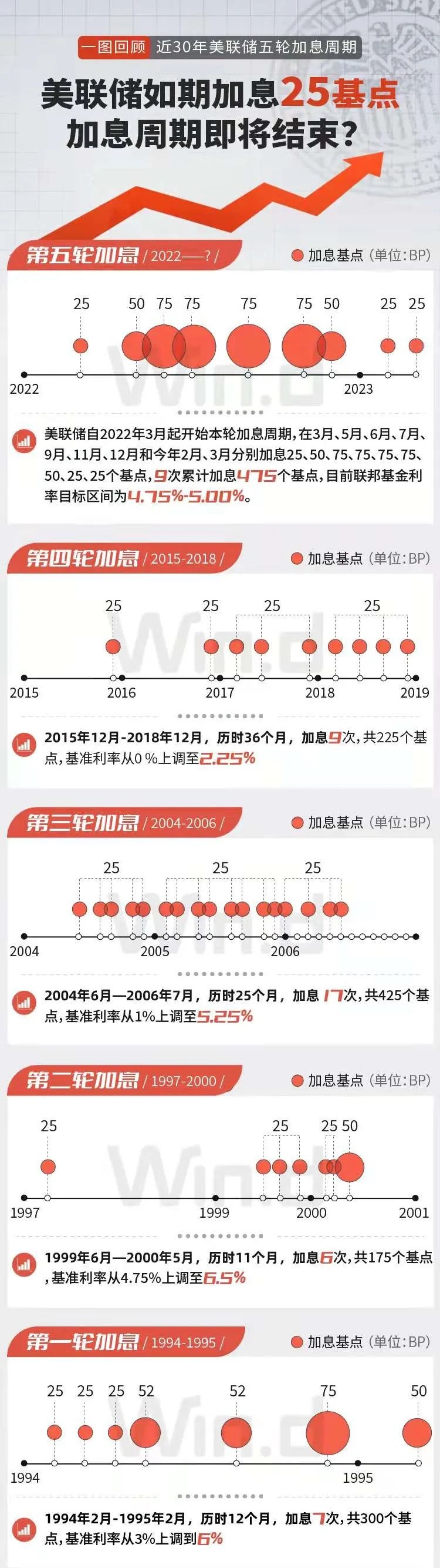 据Wind数据统计,近30年美联储五轮加息周期如下: