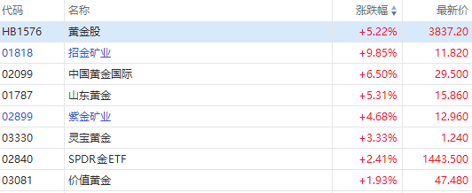 港股黄金概念股午后集体上涨,招金矿业涨超9%、山东黄金涨超5%、紫金矿业涨超4%、灵宝黄金涨超3%。