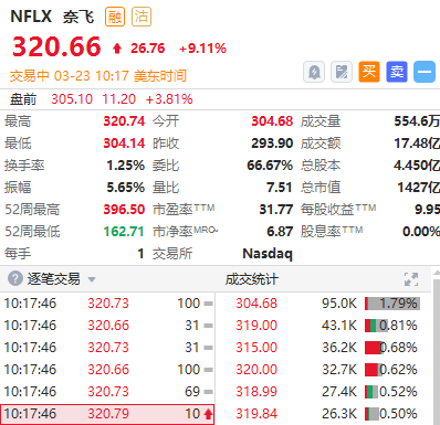 华盛资讯3月23日消息,美股明星科技股多数上涨,奈飞涨超9%创近四个月以来最大盘中涨幅,宣布年内将再发布40款新的视频游戏;特斯拉涨超4%报199.02美元每股,成交额60亿美元;Meta涨近3%,微软、谷歌、亚马逊、苹果均涨逾1%。
