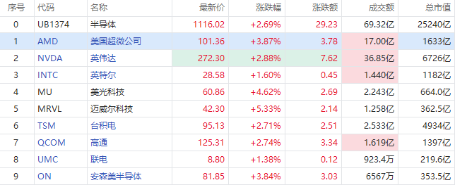 美股半导体板块走强,3倍做多半导体指数ETF-Direxion $SOXL 涨超8%。截至发稿,迈威尔科技涨5.33%,美光科技涨4.62%,AMD、安森美半导体涨逾3%;台积电涨2.71%,联电、高通、英特尔跟涨。