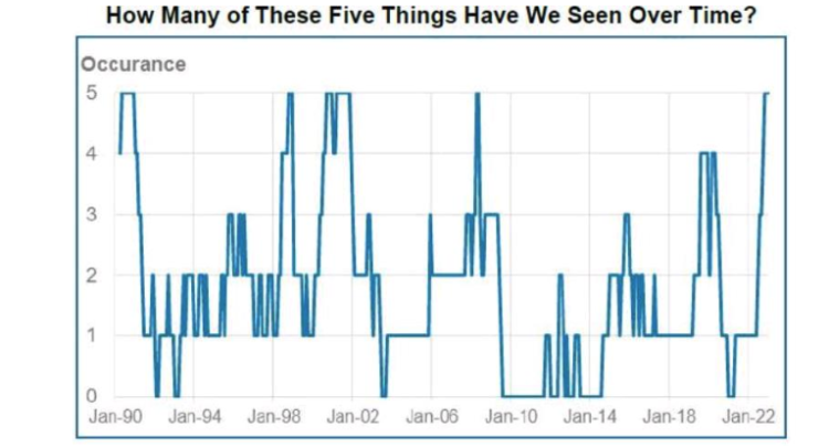 历史经验表明(如图表所示),这五个事件往往在重大市场危机(2007年、2001年)之前聚集在一起,即“今天所有五个事件都发生了,这是罕见的。”