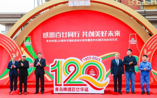 3月21日,“感恩百廿同行 共创美好未来”青岛啤酒120周年华诞纪念标识发布暨系列主题活动启动仪式在青岛啤酒发源地——青岛啤酒厂举行,120岁的青岛啤酒隆重发布120周年华诞纪念标识。
