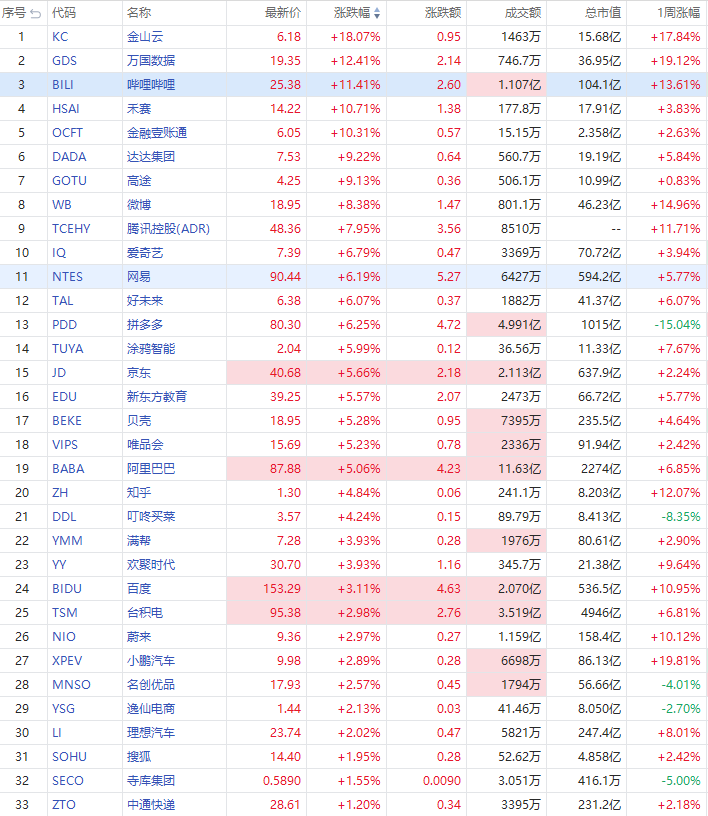 截至发稿,金山云涨18.07%,万国数据涨超12%;中资教育股普涨,高途涨超9%,好未来涨6.07%,新东方教育涨超5%;造车新势力蔚来、小鹏、理想齐涨超2%。