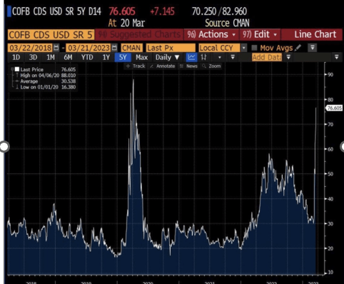 截至3月20日,第一资本金融公司的信用违约互换价格(CDS)正在暴涨,在几天内从30美元上涨到76美元,涨幅达153%。这不得不让人想起上周早些时候瑞信飙升的CDS。