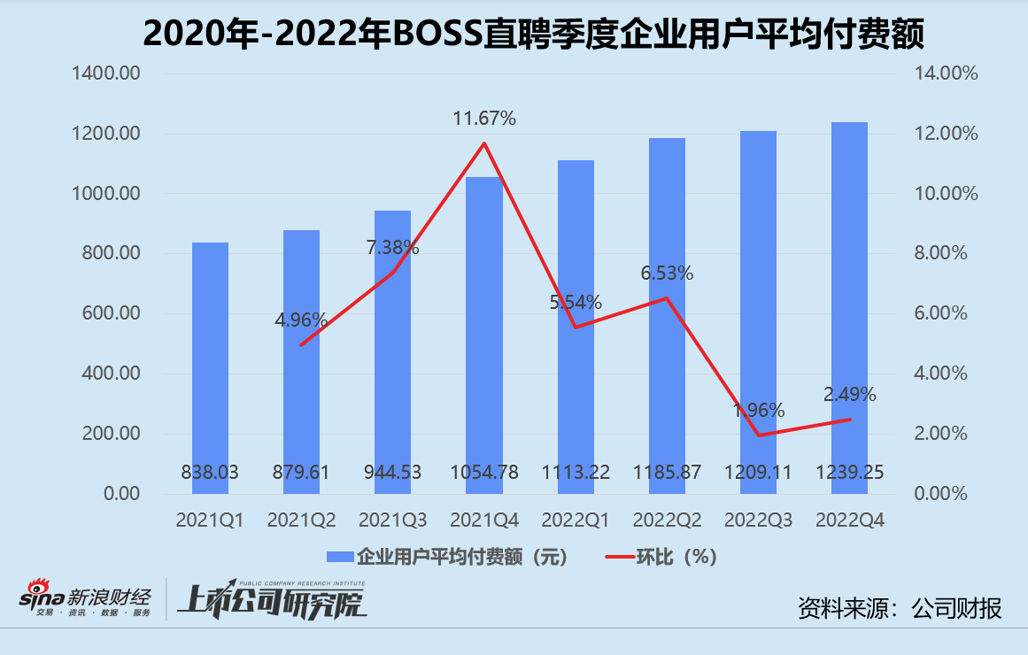 在这样的情况下,快手所提供的直播招聘服务双向免费,这无疑对BOSS直聘造成了降维打击。据财报数据显示,2022年BOSS直聘的企业用户12个月平均付费额在1100元以上,第四季度该指标再创新高至1239.25元,同比增长17.49%。