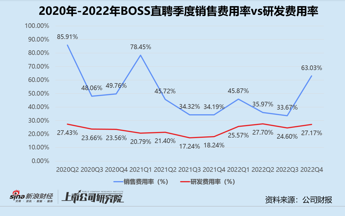 然而从费用率的层面来看,2022年第四季度研发费用占当期总营收的比例约为27.17%,虽较2021年第四季度增长近9%,但仍远低于同期销售费用率约36个百分点。结合往期数据分析,BOSS直聘的研发费用率始终保持在20%-25%上下,而销售费用率最低没有跌破过30%。不难看出,烧钱营销换增长依然是BOSS直聘目前的主要策略。