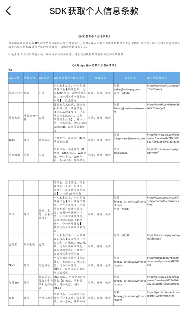 SDK条款中涉及多项用户信息的收集、存储、使用。