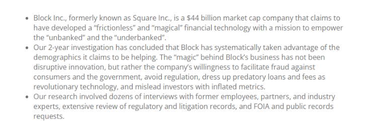报告中指通过为期 2 年的调查,得出的结论是,Block 系统地利用了它声称有帮助的数据。Block 业务背后的“魔力”并非颠覆性创新,而是该公司愿意促进对消费者和政府的欺诈、规避监管、将掠夺性贷款和费用伪装成革命性技术,并以夸大的指标误导投资者。