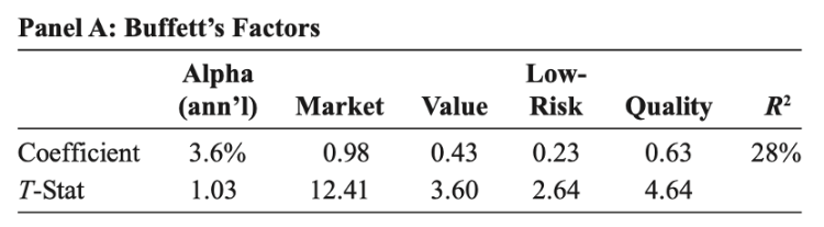 BRK对传统风险因子也产生了显著的alpha。然而,当控制了巴菲特在其著作中描述的一些投资风格因子时,这种alpha在统计上就变得不显著了。所以,这里的"巴菲特因子"是: