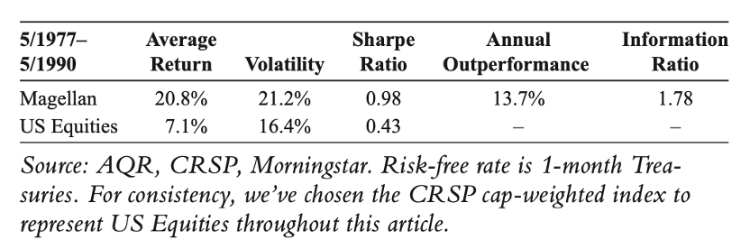 1977年5月至1990年5月,彼得·林奇执掌富达麦哲伦基金(Fidelity’s Magellan Fund)。在此期间,共同基金从约2000万美元增长至140亿美元(同时考虑回报和资金流入),并实现了平均高于现金收益21%的佳绩(而同期股市的超额收益为7%)。
