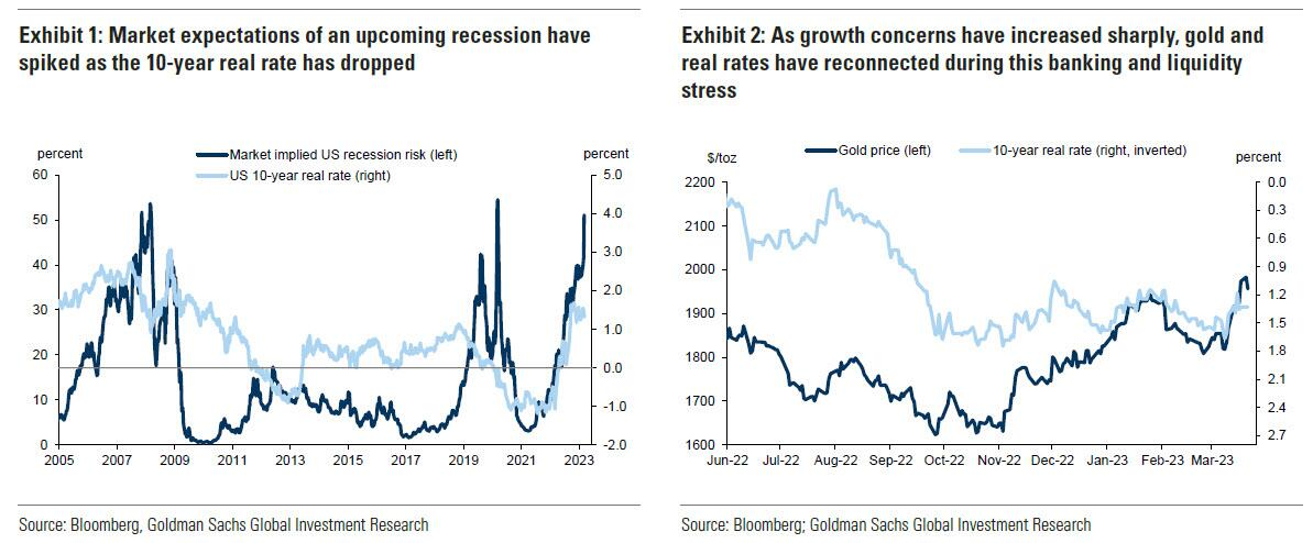 高盛表示,一段时间以来,黄金一直在增长风险和通胀风险之间摇摆,今年第一季度只是突显了市场情绪的反复无常。最初,中国重新开放导致美国经济增长快速复苏,美元走低,这一“金发女郎”情景将金价推高至1950美元/盎司,但强劲的美国宏观和核心通胀数据迅速改变了这一局面,推动金价再次回落。接着,随着人们对美国银行体系压力的担忧因加息而持续,以及政策制定者被迫干预以确保金融稳定先于价格稳定,黄金与实际利率、美元和更广泛的信贷风险之间的关系已经被重新调整。高盛总结说: