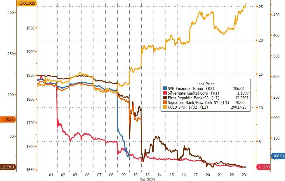 对于高盛的报告,零对冲点评道:什么叫“缓慢的磨砺”?什么叫“2100美元目标面临挑战”?按照这个速度,黄金将在几天内达到2100美元的历史新高,因为市场低估了一旦再有几家银行倒闭,很快就会出现“绝对恐慌”;如果财政部最终投降并推出全面存款保险,这个价格目标就会更快实现。正如我们之前解释的那样,那将是“美元末日”的开始。