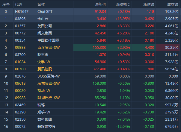 ChatGPT概念股走高,截至发稿,金山云涨近14%;美图公司涨近9%,报2.86港元;阅文集团涨5.20%;百度集团-SW涨近3%。