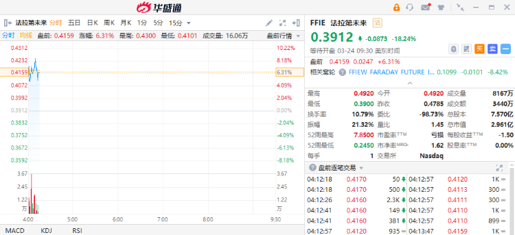 截至发稿,法拉第未来盘前涨超6%,公司宣布启动FF 91 Futurist开始生产倒计时,该车型将于美国时间2023年3月29日(北京时间3月30日)开始生产(SOP)。