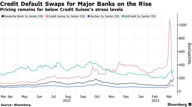 尽管监管机构一直在试图平复市场对欧美银行业稳定性的担忧情绪,但效果显然并不明显,德意志银行(DB.US)则成为了这场动荡中的最新焦点。标普全球的数据显示,周四,德银的信用违约掉期(CDS)从前一天的142个基点飙升至173个基点。据Refinitiv的数据,这是德银CDS自2019年有记录以来的单日最大涨幅。而在硅谷银行倒闭引发的银行业危机开始之后,德银的股价也出现了大幅下跌。
