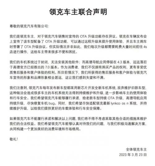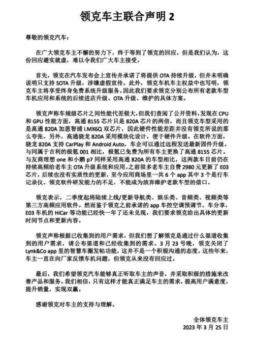 在看到领克官方声明之后,领克车主再次发表了第二份联合声明,要求领克分别公布所有老款车型车机应用和系统的后续进店升级、OTA 升级、维护的具体方案,以及系统更新具体时间节点和更新内容,同时驳斥了领克所说硬件性能问题。