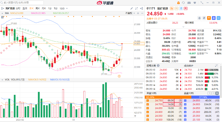 3月27日消息,兖矿能源拉升涨超8%,现报24.85港元每股,成交额2.34亿港元,2022年归母净利润同比增长89%至307.7亿元,分红比例提升至69%。