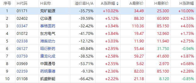 截至发稿,兖矿能源A股涨停,H股现涨10%,泰格医药A股涨3.94%,H股现涨4.03%,康龙化成A股涨2.58%,H股现涨3.87%。