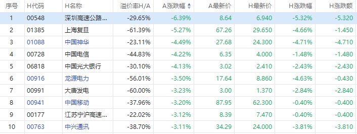 上海复旦A股跌5.27%,H股现跌4.66%,中国神华A股跌4.49%,H股现跌4.71%,中国电信A股跌4.22%,H股现跌1.48%。