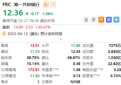 美股地区性银行股盘前走强,第一共和银行涨超20%、阿莱恩斯西部银行涨6%,德意志银行涨超2%。据知情人士透露,美国当局正在考虑扩大银行业紧急贷款工具,从而给第一共和银行更多时间来巩固资产负债表。此外,美国联邦存款保险公司(FDIC)网页的一份声明,第一公民银行签署了一项协议,同意收购硅谷银行所有存款和贷款。