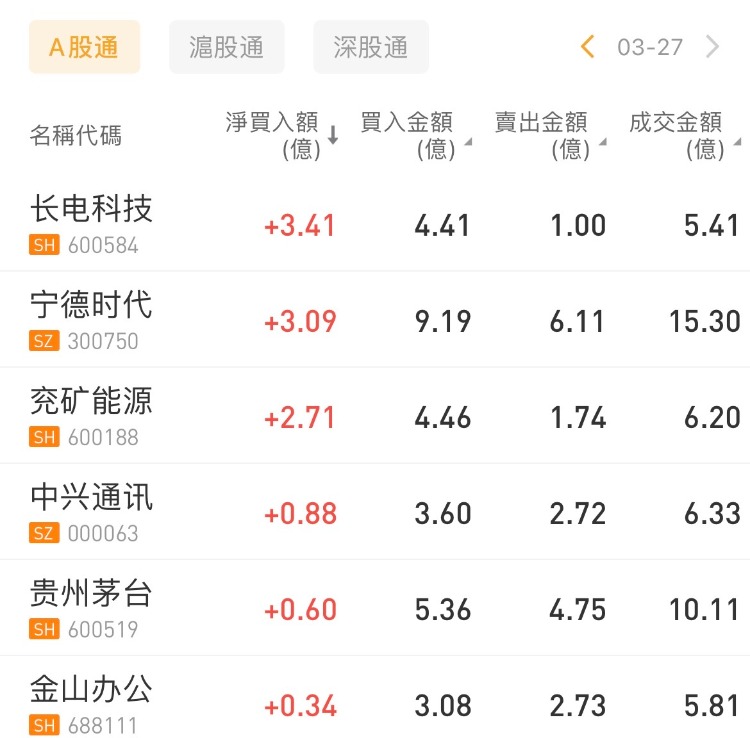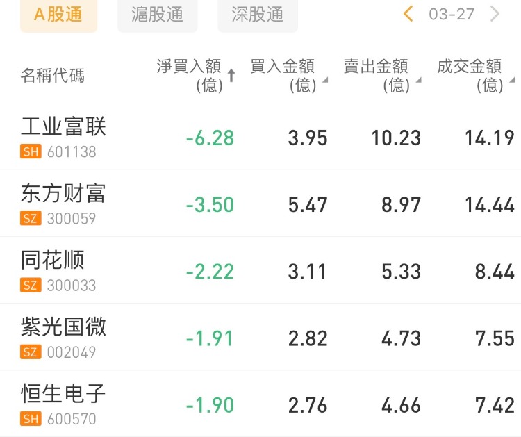 北向资金今日净卖出6.94亿元。工业富联、东方财富、同花顺分别获净卖出6.28亿元、3.5亿元、2.22亿元。长电科技净买入额居首,金额为3.41亿元。