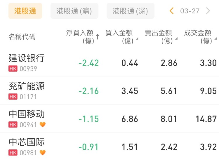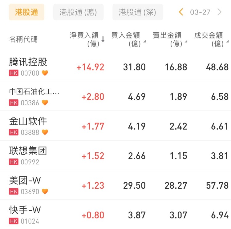 南下资金今日净买入港股42.64亿港元。腾讯控股、中国石油化工、金山软件分别获净买入14.92亿港元、2.8亿港元、1.77亿港元。建设银行净卖出额居首,金额为2.42亿港元。注:南下资金自3月6日迄今已连续16个交易日净买入腾讯,累计超125亿港元。