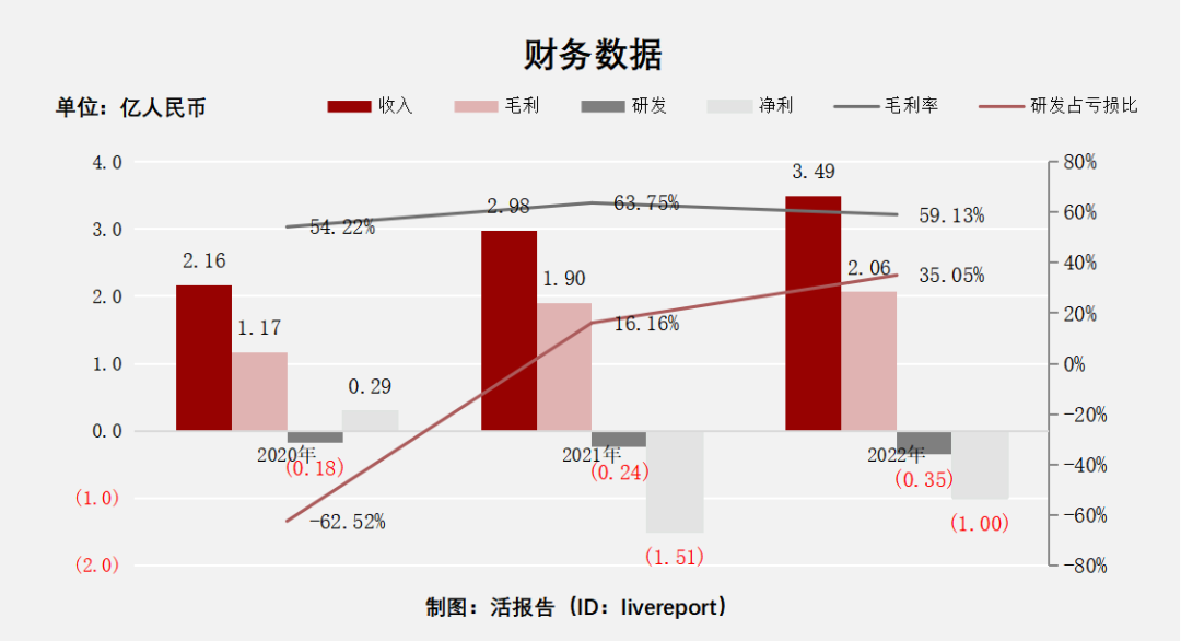 净利润21、22年是亏损状态,研发投资基本稳定在0.2亿左右,研发占亏损比例较高,毛利率基本稳定在5-60%左右;
