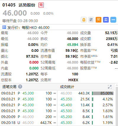 达势股份公司全球发售1279.9万股股份,净筹资4.599亿港元;每股发售价46港元,每手100股,一手中签率100%,公开发售未取得足额认购。