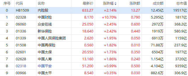 其他成分股方面,众安在线、新华保险涨超2%,中国人民保险集团、中国太保、中国人寿涨逾1%,中国平安、中国太平跟涨。