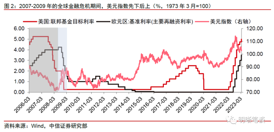 回溯2007-2009年的全球金融危机,欧美央行对于风险事件的应对措施和应对节奏存在差异,导致美元指数呈现“先下后上”的趋势。具体来看: