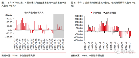 经济基本面等内部因素改善或对人民币形成支撑。基本面角度:春节之后,国内经济基本面整体呈现稳步修复态势,但修复的结构性分化依旧明显,政策有望保持力度。拉长到全年维度来看,我们认为经济动能同比和环比的顶点出现在二季度的概率较大。随着美联储加息周期临近尾声,经济基本面对于人民币的支撑料将逐步凸显;外汇供需角度:从银行代客结售汇数据来看,2月的结汇率录得70%,较1月读数上升9个百分点,表明当人民币汇率出现回调时,居民和企业端选择“逢高结汇”,显示出其对于人民币汇率未来走势的信心。分账户来看,主要体现为经常项目中货物贸易和服务贸易的银行代客结汇规模走高;资本流动角度:3月中下旬以来,A股市场北向资金基本维持一定规模的净流入状态。债市方面,受中美利差倒挂制约,2月境外机构仍减持约763.6亿元规模的人民币债券资产,但减持规模环比收窄,其中国债和政金债的减持幅度环比下降、同业存单转为净增持。结合前文所述,海外风险事件或有助于提升我国金融资产对于外资的吸引力,金融市场的资本流入料将对人民币形成一定利好。