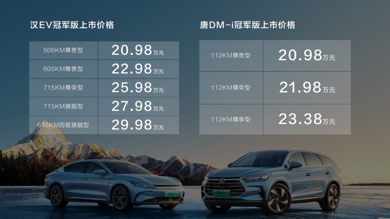 3月16日晚间,比亚迪汽车官方微博发布消息称,汉唐双旗舰冠军版上市,汉EV冠军版官方指导价20.98-29.98万元,唐DM-i冠军版官方指导价20.98-23.38万元。
