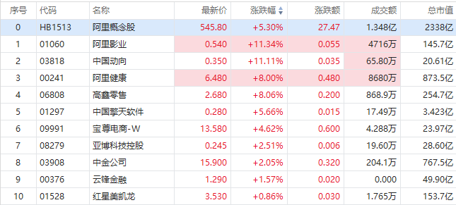 3月29日消息,阿里概念股集体上涨,截至发稿,阿里影业涨11.34%报0.54港元每股;中国动向涨超11%,阿里健康涨8%报6.48港元每股,成交额8680万港元;高鑫零售涨超8%,宝尊电商-W涨4.62%,中金公司、红星美凯龙跟涨。