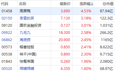 餐饮股表现活跃。周黑鸭涨超4%,奈雪的茶涨超3%,
