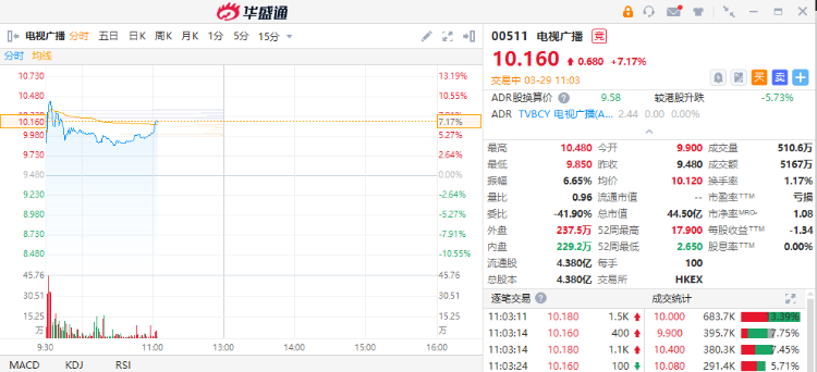 个股异动方面,电视广播一度涨超9% ,目前涨幅收窄至7.17%,总市值44.5亿港元。 TVB(电视广播)表示将于3月30日在淘宝直播间举行第二场直播带货,由旗下艺人陈自瑶及其搭档一起参与。