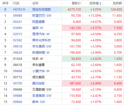 盘面上,大型科技股领衔上涨,宣布史上最大调整,阿里巴巴一度大涨近15%表现最佳,京东涨超6%,腾讯、网易、美团、百度齐涨;阿里概念股全线走俏,家电股、家电股、零售股、汽车股多数上涨。另一方面,生物医药股部分走低,医脉通逆势跌4%。