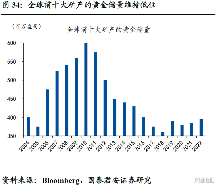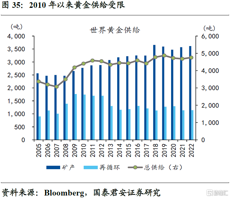 同时,黄金供给收缩、需求增长,进一步强化商品端的抗通胀属性。2010年以来,黄金再循环产量持续走低,尽管矿产量大幅增加,整体供给年均复合增速接近零。伴随着开采量的不断提升,全球前十大矿产的黄金储量较2010年顶峰时的6亿盎司,大幅回落至2022年的4亿盎司,这意味着新增产能持续受限。与此同时,投资、装饰等需求属性的持续彰显,使得黄金供需依然维持相对紧平衡。