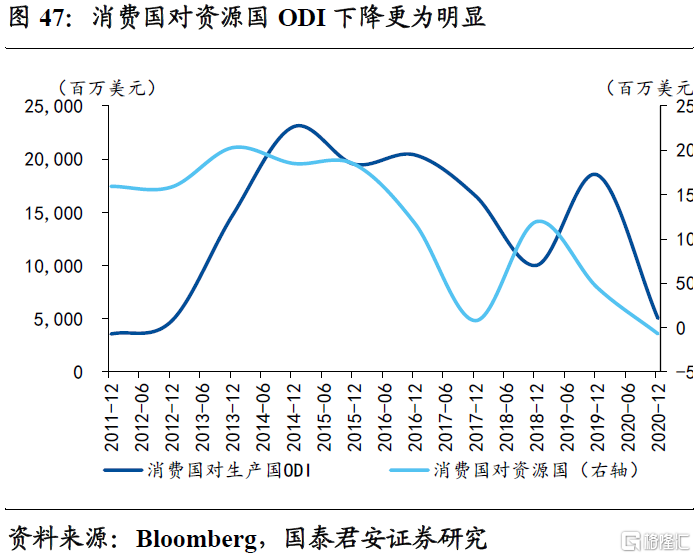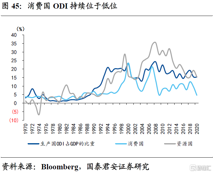2、消费国ODI持续位于低位且不断下行,本质上是发达经济体产业回归产业保护的抬头。资源国ODI下行最为迅速,生产国ODI处于中位,背后是产业承接的不畅。