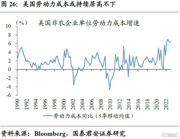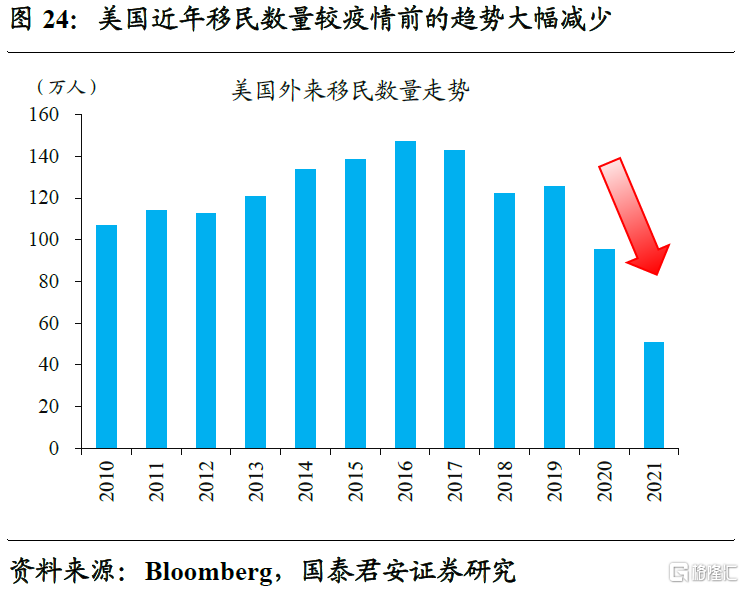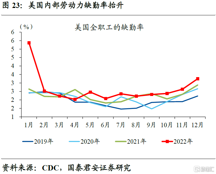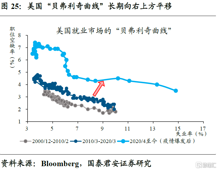 通胀中枢的抬升,直接影响到市场对于中长期通胀问题的重新定价。尽管基数效应、房租滞后回落等因素的共同影响下,美国CPI同比从9.1%的高位回落到6%。但影响通胀中枢的核心矛盾未得到有效解决,比如劳动力成本。“Long Covid”等影响下,美国内部劳动力缺勤率显著抬升,相当于劳动力供给系统性降低,再考虑到移民数量缺口放大等因素的共同作用,反映美国就业供需匹配的“贝弗利奇曲线”长期向右上方平移。这意味着,劳动力成本的抬升大概率是个长期现象。
