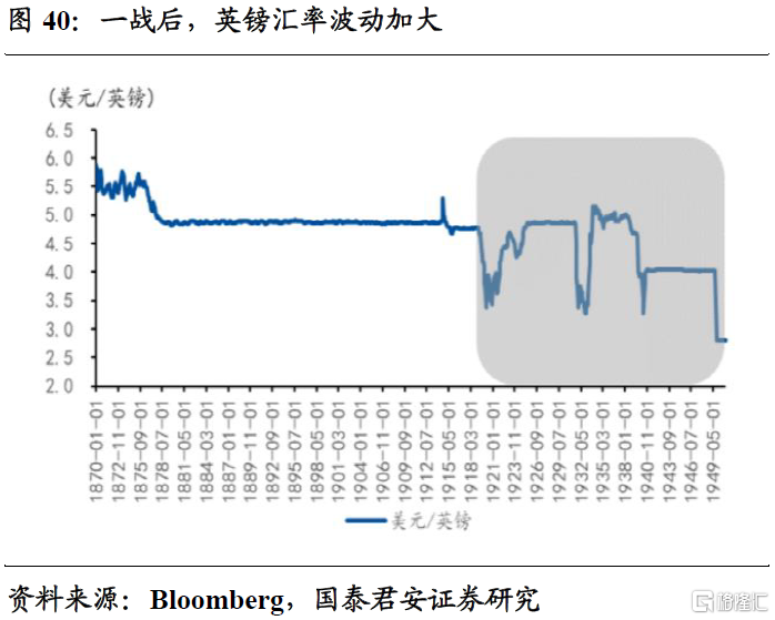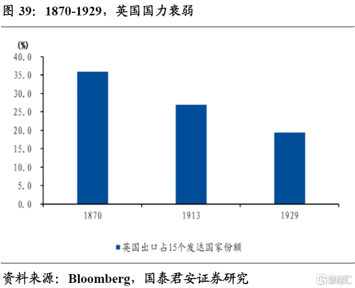 货币秩序的重塑,往往带来黄金的历史机会。一战后,英国世界制造业中心的地位被美国所取代,在世界贸易中所占贸易份额也在缩小。在此背景下,英国为恢复其国际地位,于1925年宣布恢复金本位制,规定1英镑兑换4.86美元的战前汇率水平,但战后英镑的市场汇价只有3.5美元,英镑被明显高估,进一步损害了英国商品的出口竞争力。恢复金本位直到二战前,期间金价涨幅翻倍,并且大幅跑赢其他工业品及农产品的价格表现。