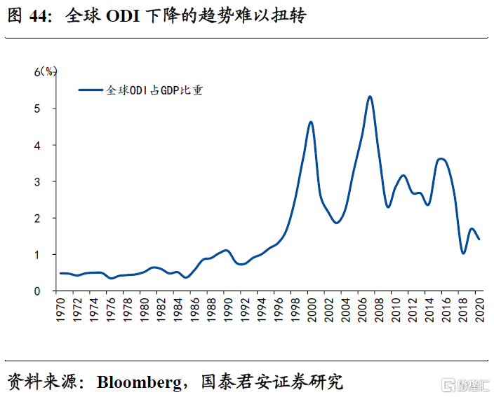 1、全球对外直接投资(ODI)经历了明显回落,疫情进一步阻止了ODI反弹,目前已经回到90年代水平,大国产业本土化、并行化的趋势不可扭转。