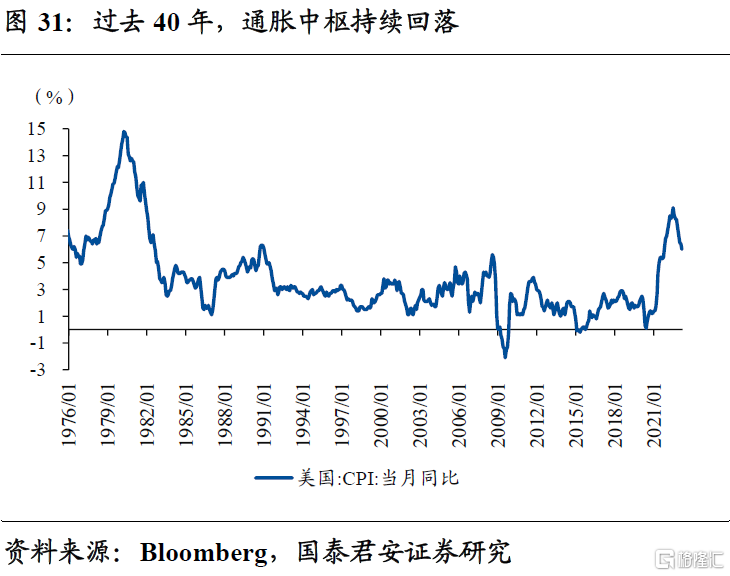 高通胀+高利率下,美国长达40年“股债双牛”的格局,可能面临重塑,有利于黄金彰显配置价值。在美国市场,10Y美债利率与美股估值呈现出显著负相关的关系。1980年代以来,伴随着通胀中枢、美联储政策利率中枢的双双下移,10Y美债利率中枢基本上一路下行。受益于此,美股迎来长达40余年的估值抬升行情。高通胀+高利率下,美股估值明显承压、将引发波动率较以往明显抬升。黄金作为对冲波动的最佳资产之一,配置价值持续凸显。